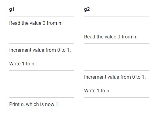 Чтобы этот тип блокировки был безопасным, крайне важно, чтобы все обращения к общим данным выполнялись только тогда, когда горутина находится в блокировке. Одной ошибки в одной горутине достаточно, чтобы ввести гонку данных и сломать программу.