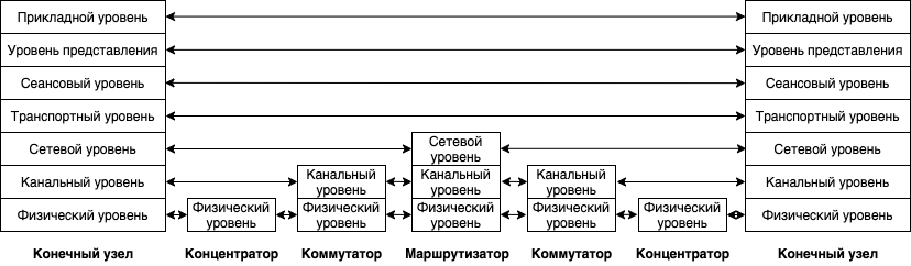 На следующей схеме представлена схема взаимодействия узлов сети. Наш пакет выходит из конечного узла слева, проходя через концентраторы, коммутаторы (работающие на канальном уровне) и маршрутизаторы, работающие на сетевом уровне:Общая схема взаимодействия узлов сети