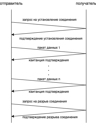 Формируются TCP-пакеты чаще всего в ядре операционной системы. Вся прелесть протокола TCP — в надёжности доставки. Использование этого протокола предусматривает установление так называемого логического соединения между двумя конечными узлами сети (перед этим, естественно, такое соединение нужно согласовать). Надёжную доставку пакетов протокол TCP обеспечивает посредством нумерации пакетов, подтверждения их передачи квитанциями, а также контроля правильного порядка пакетов. Схема установления логического соединения, передачи данных и разрыва соединения представлена на рисунке ниже:Работа хостов с помощью логического соединения