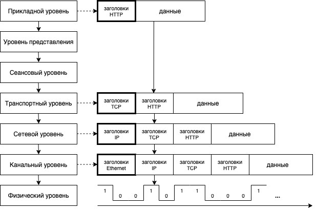Операционная система, получив HTTP-сообщение от браузера, должна "встроить" его в пакет протокола нижележащего уровня — TCP. Такой процесс встраивания называется инкапсуляцией. Операция эта осуществляется на каждом уровне: пакеты вышележащего уровня инкапсулируются в пакеты нижележащего. И на самом нижнем уровне мы получаем информационную “матрёшку” с вложенными друг в друга пакетами, со служебной информацией в виде заголовков, добавленных на каждом уровне: